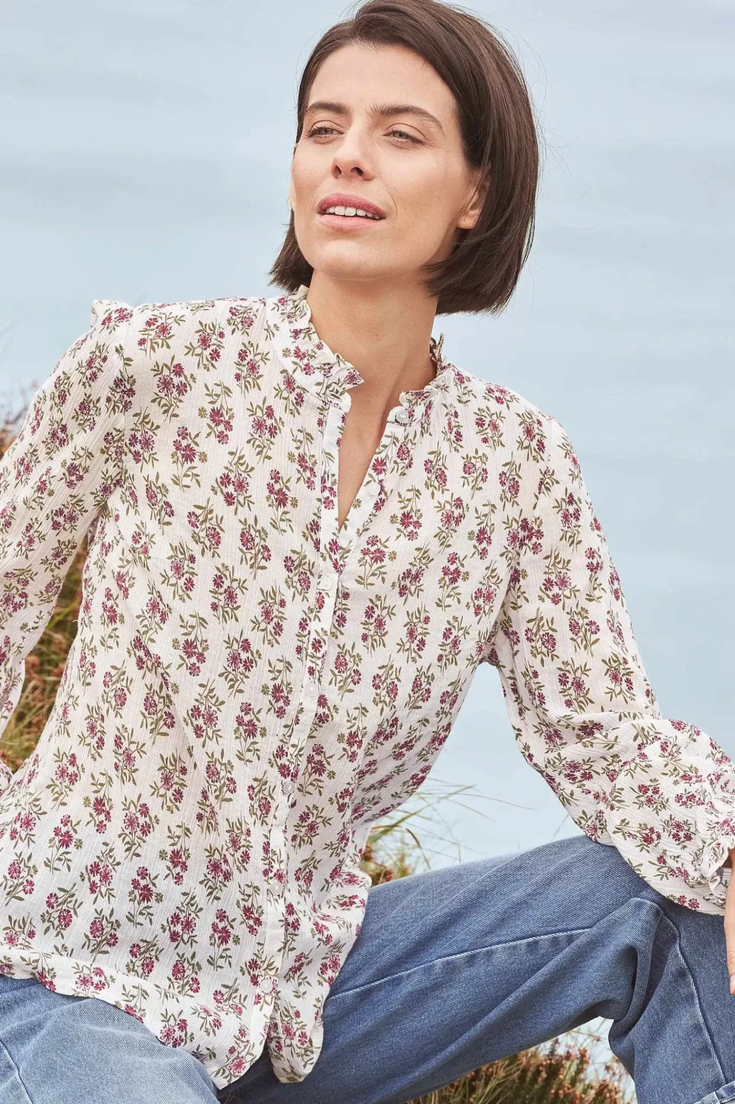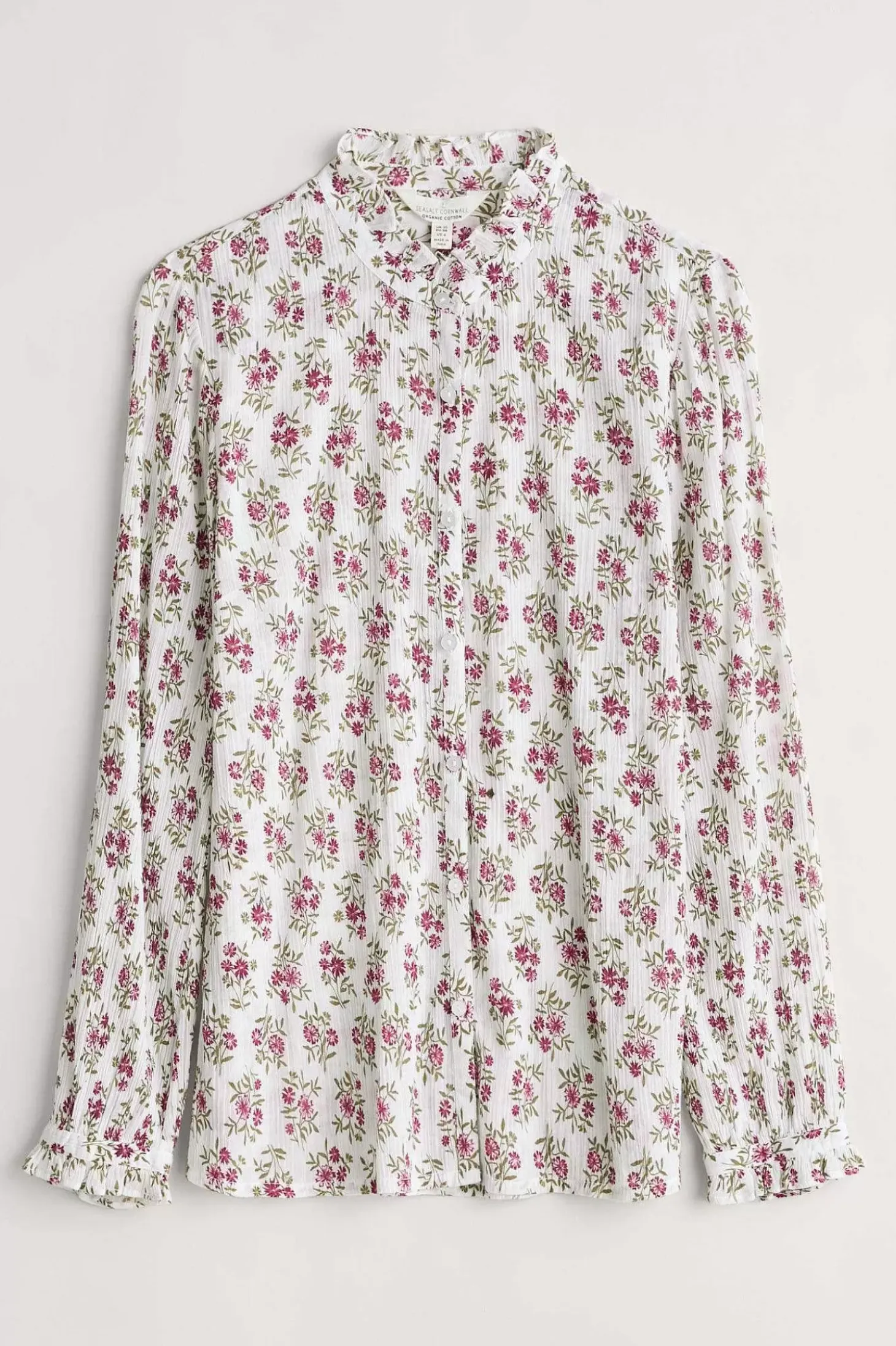 Woven From Soft Cotton, Our Garden Plot Shirt Will Fast Become A Wardrobe Favourite. Cut To An Easy Fit And Finished With A Delicately Ruffled Neckline And Cuffs Plus Button-Down Front, Pair With Denim And Boots To Add A Touch Of Femininity To Your Autumnal Outfits.